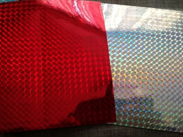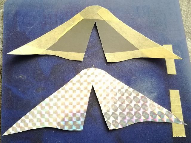 ですので写真のような100均で売っているシールタイプのホログラム折り紙を使用し、マントもボディ同様キラキラにしてやります。