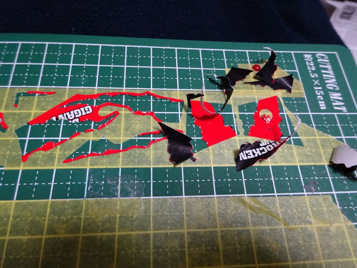 それと今回はフロントのGの文字や側面のBROCKEN GIGANTの文字はオミットします。流石にこの小さな文字を切り抜くのはしんどそうなので。